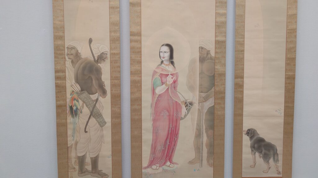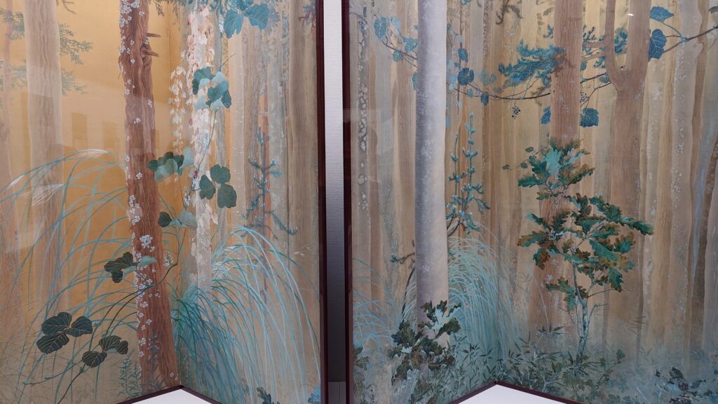 日本絵画を知りたかったら下村観山を見ろ。何故なら、日本絵画の終着点が下村観山の絵にはあるからだ。《木の間の秋》を見てみよう。背景が黄金に鈍く光り、いろいろな色の木が真っ直ぐに立っている。林の合間には葉脈のはっきりした野草が勢いよく描かれている。春蘭、やまぶどうの蔓、百合など日本画によく登場する素材だ。光の変化による色彩の移ろいが巧みに表現されていて見事だ。《毘沙門天、弁財天》は、鮮やかな金色の屛風が下地だ。毘沙門天と弁財天がお馴染みの鮮やかな色彩の衣装を纏って描かれている。空間の使い方が贅沢で見事だ。そして執拗なまでに細密さへの拘りが観られる。会場では拡大鏡のレンタルが行われていた。私は全体を俯瞰して見る方が好きなで遠慮したが、拡大して見たくなる気持ちもわかる。それほどまでにどの絵も細密なのだ。